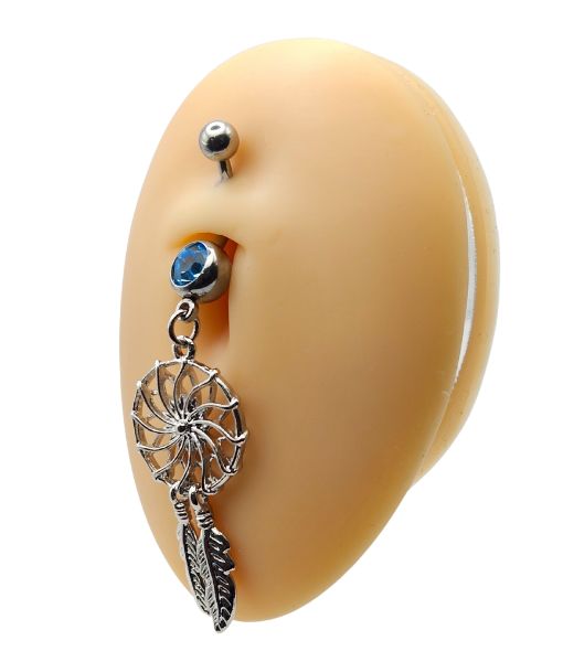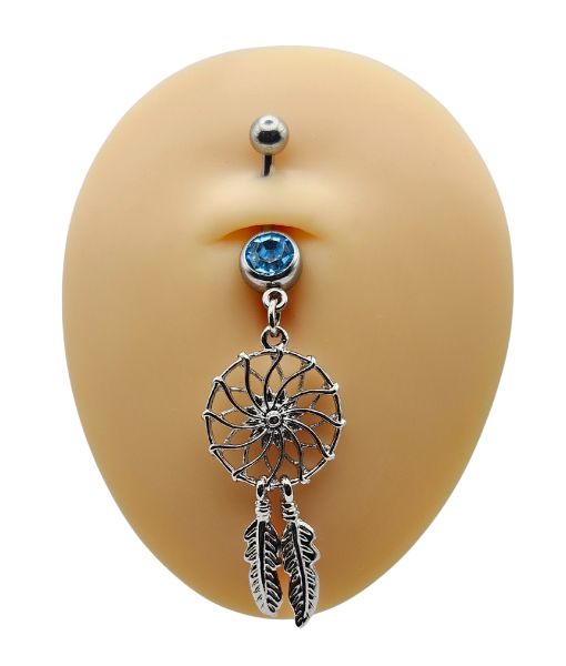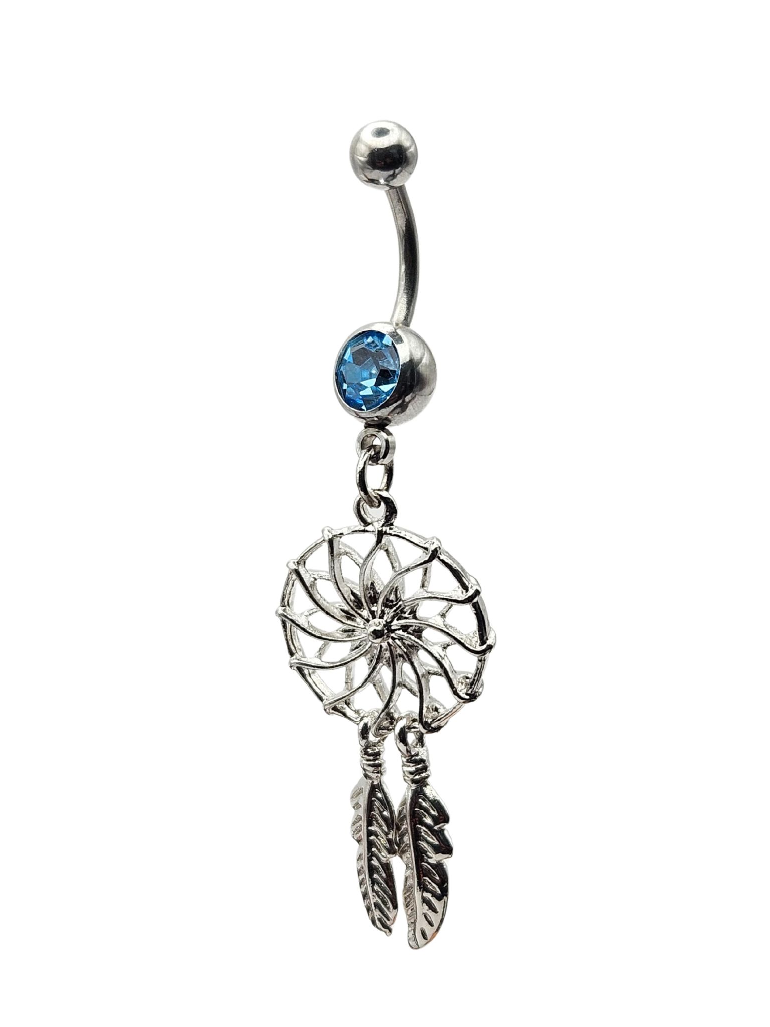 Belly Ring – Dreamcatcher & Feather – Aqua CZ – 316L Surgical Steel