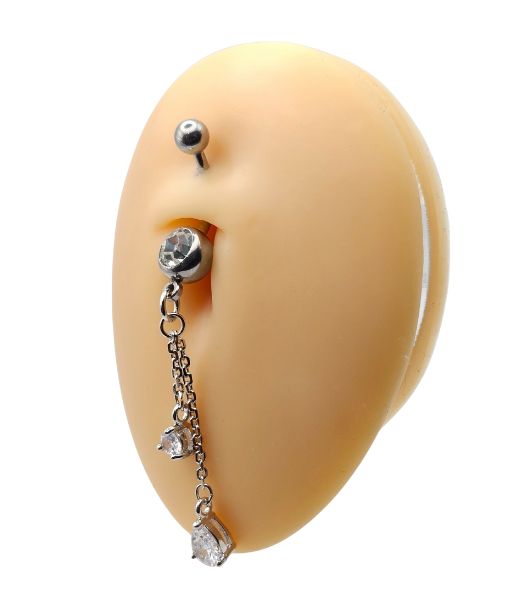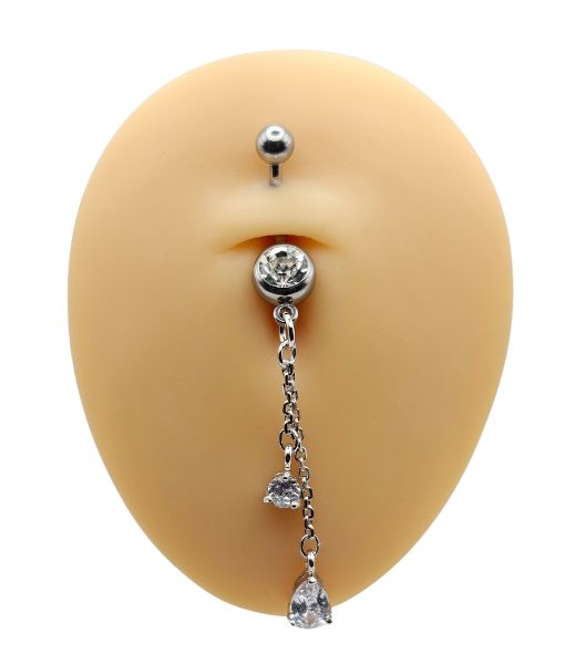 This elegant belly ring features a clear crystal top that catches the light with every move. The slim hanging chain adds soft motion for a clean, graceful silhouette.