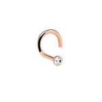 A D-shaped nose screw in rose gold PVD with a crystal accent. Secure and polished, perfect for nostril piercings. 4.