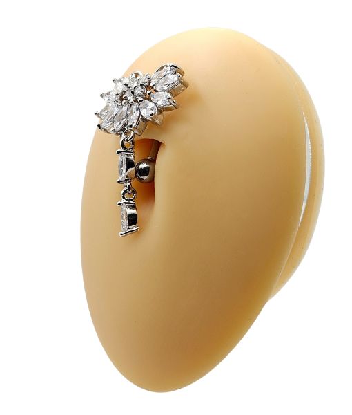 This reverse belly ring features a butterfly charm with a crystal center and clear crystals across its wings. It sits above the navel and adds a soft, floating sparkle with every step.