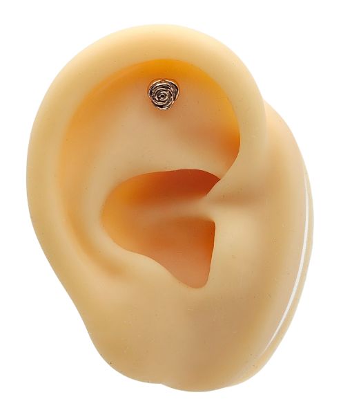 This tragus stud features a rose-shaped flower with a warm, polished rose gold finish.